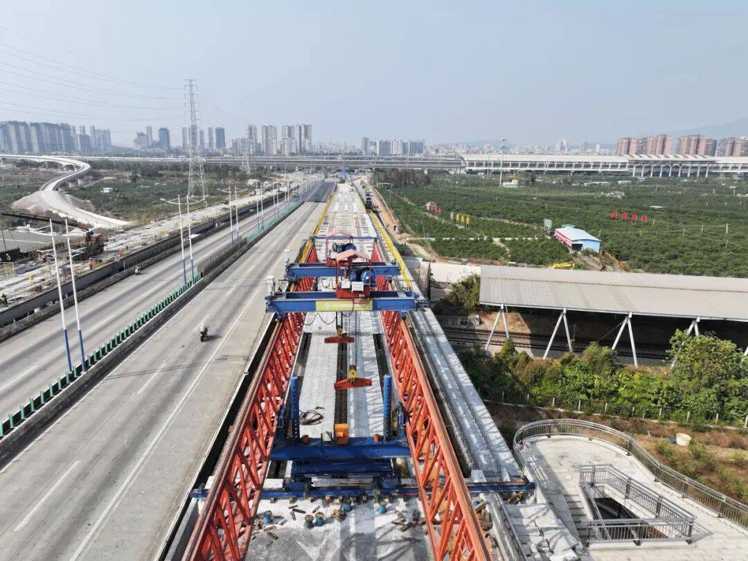 本工程上跨广珠铁路,其涉铁施工段为全线的核心攻坚段,具有技术复杂、安全要求高、协调难度大等难点,相关铁路营业线内作业均需在铁路部门批准的“天窗点”内进行,每周不超过3个凌晨施工时段,每个时段仅3小时。自去年6月启动天窗点施工以来,项目受汛期、台风等不利因素影响,天窗点申请与实施受阻,参建单位经多方协调攻坚,历时约7个月,高效利用26个获批天窗点,先后完成接触网迁改、雨棚拆除、防电棚安装等多项前置作业,并最终圆满完成全部铁路跨箱梁架设。